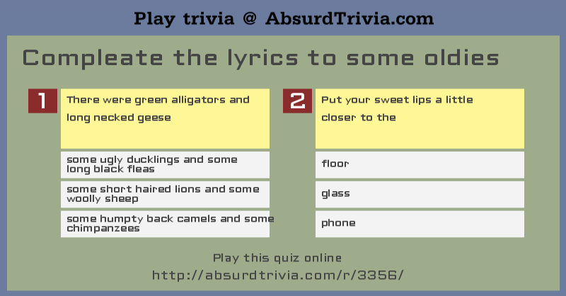 Oldies Trivia Questions : Buzzfeed editor keep up with the latest daily buzz with the buzzfeed daily newsletter!. Whether you have a science buff or a harry potter fanatic, look no further than this list of trivia questions and answers for kids of all ages that will be fun for little minds to ponder. You can use this swimming information to make your own swimming trivia questions. Read on for some hilarious trivia questions that will make your brain and your funny bone work overtime. It's like the trivia that plays before the movie starts at the theater, but waaaaaaay longer. Trivia quizzes are a great way to work out your brain, maybe even learn something new.